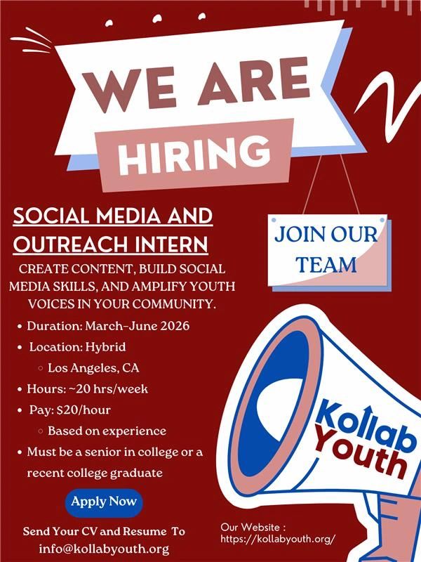 Kollab Youth is seeking a creative and motivated Social Media Intern to support our communications and outreach efforts. This paid internship provides hands-on experience in digital content creation, social media strategy, and nonprofit marketing. The intern will help tell the stories of our youth participants, programs, and community impact, while also developing professional skills relevant to future careers in media, marketing, and communications.